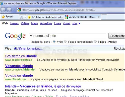 Lorsque vous lancez une recherche dans Internet Explorer en passant par les moteurs de recherches intégrés au navigateur, les résultats viennent remplacer la page en cours. Vous pouvez choisir d'afficher les résultats dans un nouvel onglet.